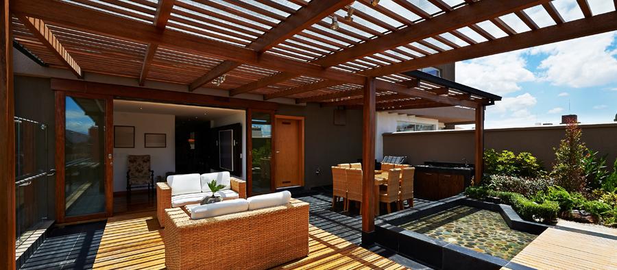 Pergolado ou pérgola é uma estrutura de madeira utilizada em ambientes externos e internos que, além de dar charme a qualquer projeto, serve de proteção contra chuva e sol. Estas estruturas podem ser ornadas com plantas ou cobertas com palha, vidro ou placas de policarbonato.